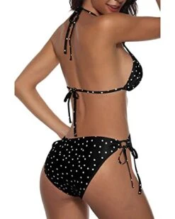 Women’s Sexy V Neck Low Back Low Waisted Tie Side Bikini-Black White Dot
