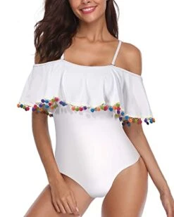 Flattering Off Shoulder One Piece Swimsuit Ruffles-Black White Dot