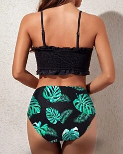 Flounce One Piece Swimsuit Off-The-Shoulder Lace-Up Backless Bathing Suit-Black And Green Leaf