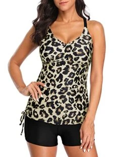 Add some sophistication to your swimwear collection with this two piece tummy control tankini, boasting a functional drawstring tie side top, removable padded bra, and athletic style boyshorts.