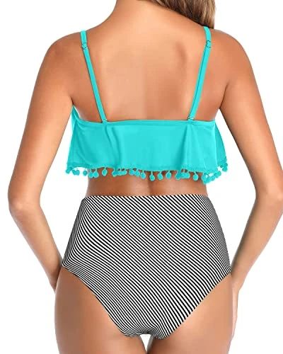 This two piece swimsuit features a flowy ruffled top with pom pom detailing and high waisted bottom for ultimate tummy control.