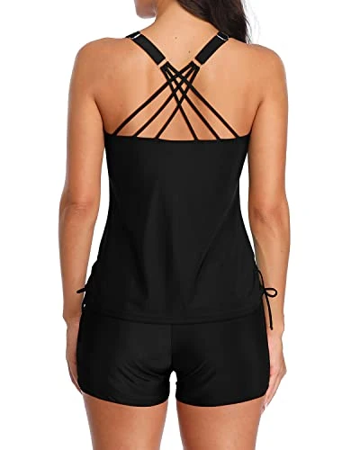 For a modest yet flirty look, opt for this two piece tankini with shorts and removable padded bra, featuring a chic crossback strappy back and functional drawstring tie side top.