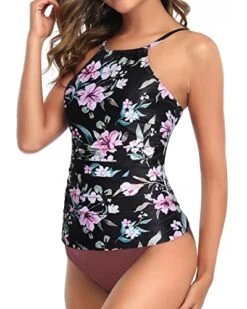 Show off your beach body in style with this two-piece tankini swimsuit for women, featuring a high neck ruched tummy control top with a retro paisley printed pattern and a solid high cut tankini bottom that enhances your curves.