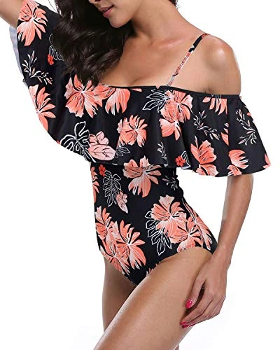 Hit the beach in style with this off shoulder swimsuit, designed with a flattering ruffle detail and versatile removable straps.
