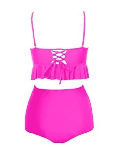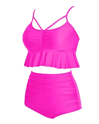 Flattering and comfortable, this high waisted two piece swimsuit features adjustable straps, a natural-looking removable padded bra, ruched tummy control bottoms, and fashionable ruffle and lace-up details, perfect for any beach vacation.
