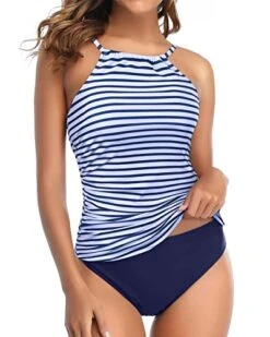 This two-piece tankini swimsuit for women is a beach day must-have, featuring a high neck ruched tummy control top and solid high cut tankini bottom that flatters your figure and provides full coverage.