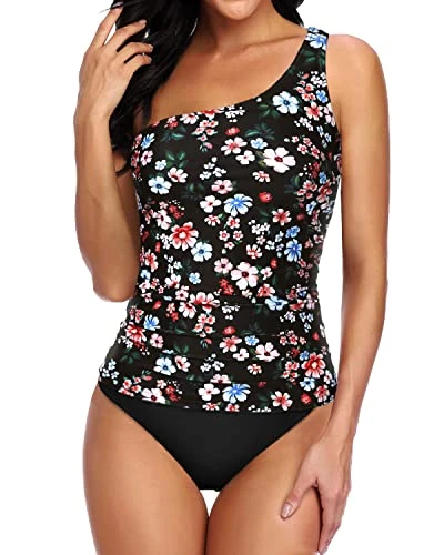 This two-piece swimsuit for women features an asymmetric one shoulder tankini top with tummy control ruched detail and removable padded bras, paired with swim shorts, making it perfect for summer occasions such as swimming, surfing, and beach parties.