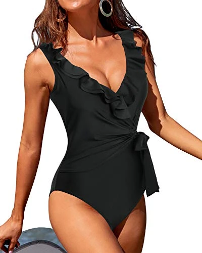 Feel confident and stylish in this black flounce backless one piece swimsuit, perfect for any vacation or honeymoon to the beach, pool, or cruise.