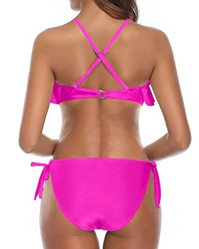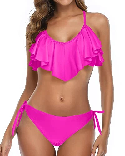 Stand out on the beach in this colorful two piece flounce bikini set with a double ruffled flounce top and a cheeky, tie-side bottom.