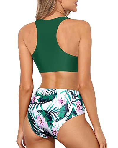 This green tropical floral two piece swimsuit set for teens girls is designed to flatter most curves with its sporty high neck tank top and comfortable, breathable fabric.
