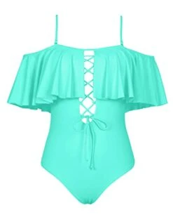 Make a splash in this sexy one-piece swimsuit with off-shoulder ruffles, a lace-up front, and padded push-up bra.