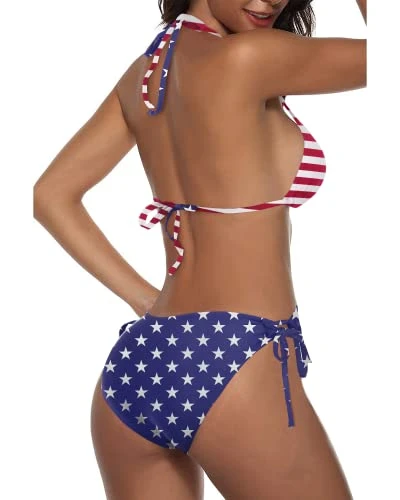 This adjustable two-piece bikini set features a sliding triangle top with removable push-up padding and double rise, scrunch at the back bottom. The comfortable and breathable fabric is perfect for water activities.
