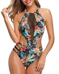 This black red flower one-piece swimsuit features a high neck halter style with a mesh patchwork bust area and cutout waist design. It has a hook closure at the back, removable padded push-up bra, and is perfect for beach vacations.