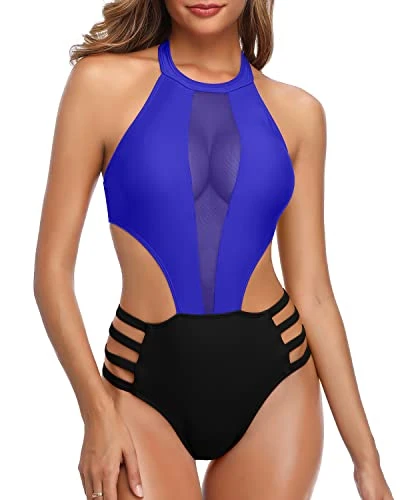 Elevate your beach look with this stunning high neck halter cutout monokini one piece mesh swimsuit, featuring a sexy plunge mesh patchwork bust area.