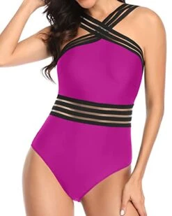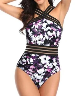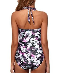Vintage halter one piece swimsuit with tummy control, ruched pattern, and padded push up bra for a flattering and slimming look. Perfect for various water activities and summer vacations.