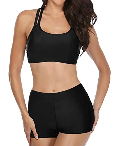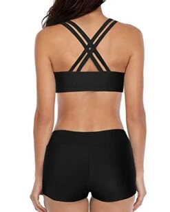 High neck design with padded push up bra and neck hook closure ensures a secure and flattering fit for the three-piece tankini set.