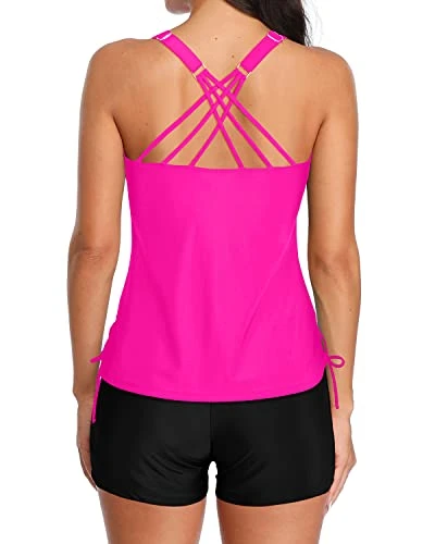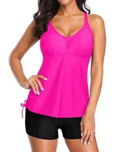 Feel confident and comfortable in this stylish and practical tankini swimsuit, perfect for showing off your sporty side with its athletic design, tummy control, and functional drawstring tie side, while also looking chic and charming with its V-neck ruched front and crisscross strappy back.