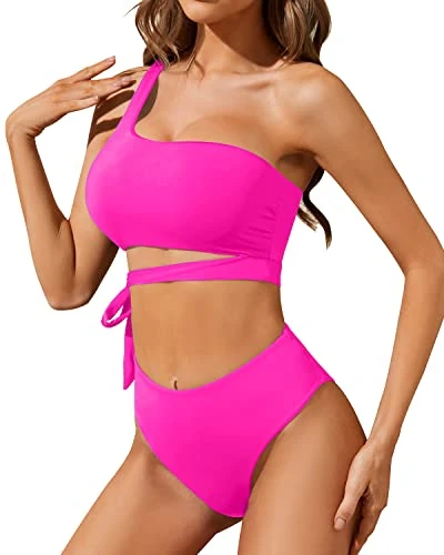 Feel confident and comfortable in this Women Two Piece High Waisted Bikini Set One Shoulder Swimsuits Tie High Cut Bathing Suits with Bottoms, designed with a double-layer fabric, a removable padded push-up bra for support and shaping, and a tummy control high-waisted bottom to hide any imperfections.