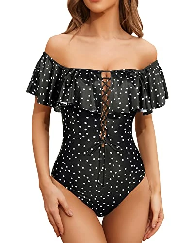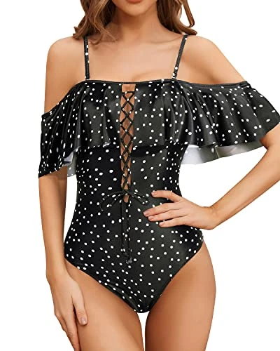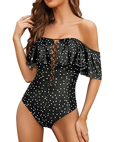 This sexy black white dot one piece swimsuit has removable straps, a padded push up bra, off shoulder ruffled flounce design, cross lace up detail, and is made of high quality stretchy, comfortable and durable fabric for a slim and charming look.