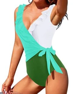 This wrap slimming one-piece swimsuit is romantic and fun! Featuring a halter neckline, back tie, ruching, ruffled trim, and a retro full-coverage bum.