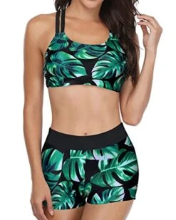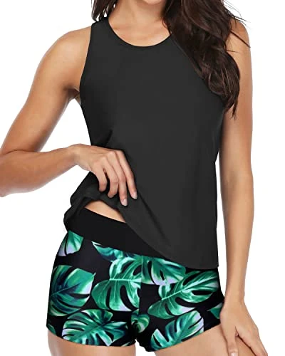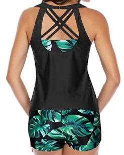 The high neck design with a padded push up bra and neck hook closure ensures a secure and flattering fit for the three-piece tankini set.