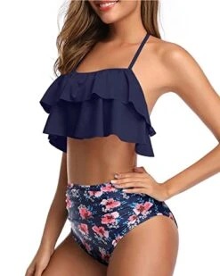 Make a statement in this adorable and sultry two-piece swimsuit, designed with high-waisted bottoms and tiered ruffles for a flattering and eye-catching look.