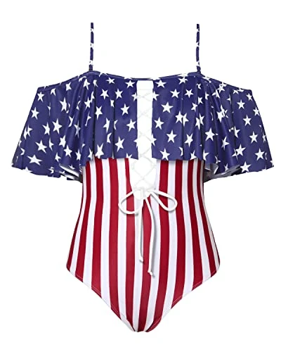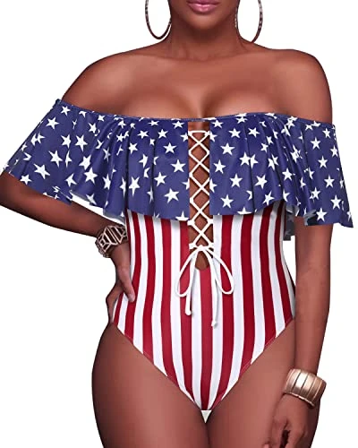This sexy one piece swimsuit has removable straps, a padded push up bra, off shoulder ruffled flounce design, cross lace up detail, and is made of high quality stretchy, comfortable and durable fabric for a slim and charming look.