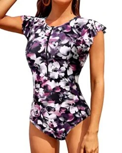 Zip-front one piece swimsuit with short-sleeved rash guard and tummy control design, suitable for surfing and other water sports.