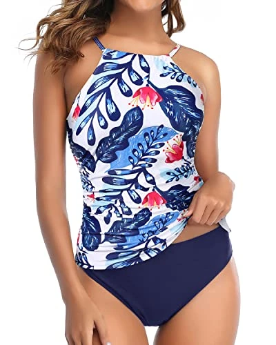 Embrace your beach body in this two-piece tankini swimsuit for women, featuring a high neck ruched tummy control top and solid high cut tankini bottom that provides a flattering fit and comfortable, breathable fabric.