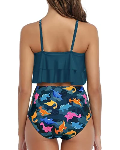 This high waisted bikini set features a double tiered ruffle flounce crop top with removable padded push up bras, paired with a ruched moderate coverage bottom, making it a fashionable and comfortable choice for family parties, summer vacations, honeymoon trips and swimming pool activities.