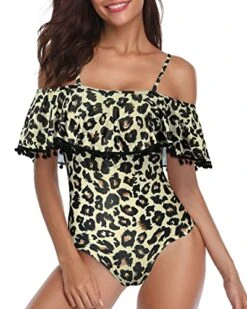 Feel confident and sexy in this cute and flirty ruffle off shoulder bathing suit, designed to provide support and lift with its adjustable straps and padded bras.