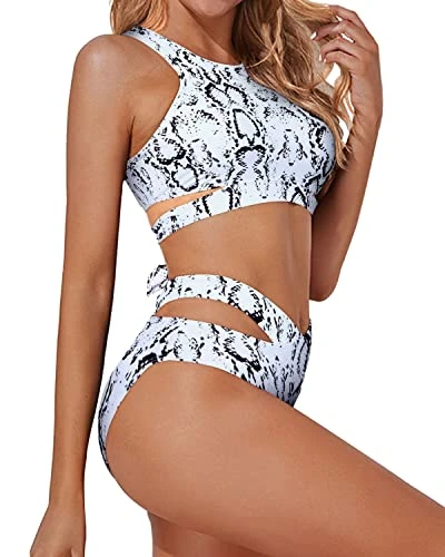 Look and feel amazing in this trendy and comfortable high neck cutout bikini set, featuring a racerback tank top with a zipper and a criss cross bandage bottom that hugs your curves.