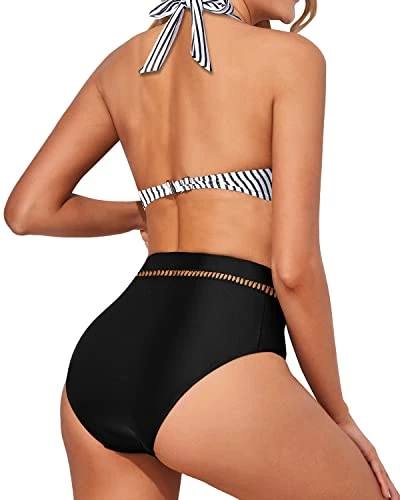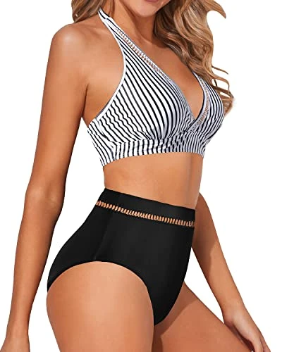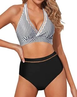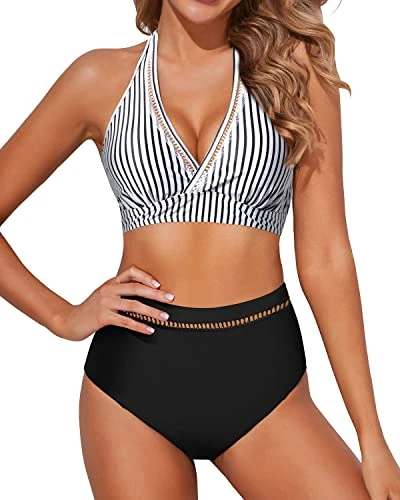 This black and white stripe two-piece swimsuit has a high-waisted bottom with tummy control and a bikini top with a push-up padded bra, halter tie, and sexy mesh design will make you look sexier.
