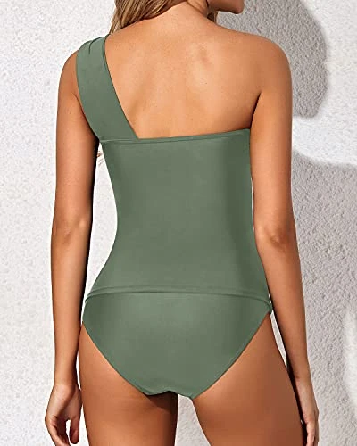 Two piece tankini bathing suits for women with one shoulder swim top and shorts. Classy and ruched tankini top with tummy control. Backless and easy to wear. Suitable for all occasions.