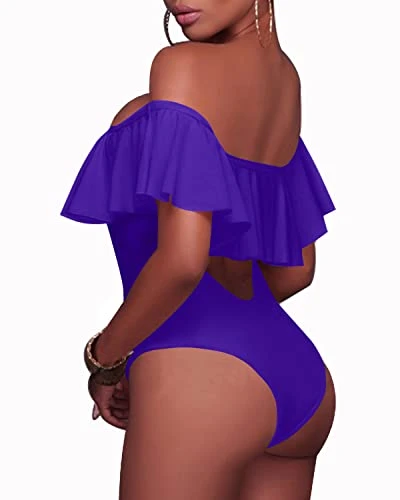 Flaunt your curves in this chic purple one-piece swimsuit featuring a lace-up front, off-shoulder ruffle design, padded push-up bra, and removable straps. Perfect for a stylish and comfortable day at the beach or pool.