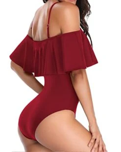 This vintage-inspired off shoulder ruffled swimsuit is a timeless addition to your swimwear collection, complete with adjustable straps and padded bras.