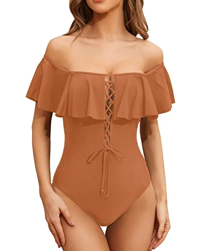 This sexy brown one piece swimsuit has removable straps, a padded push up bra, off shoulder ruffled flounce design, cross lace up detail, and is made of high quality stretchy, comfortable and durable fabric for a slim and charming look.