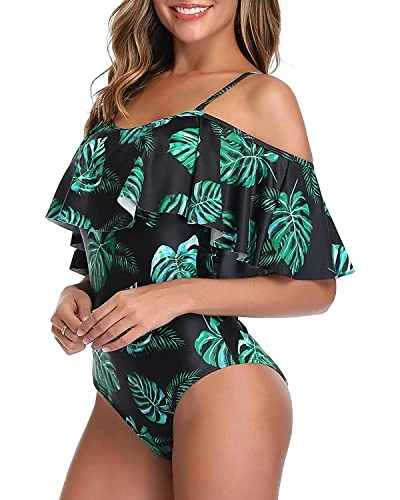 This vintage-inspired off shoulder ruffled swimsuit is a must-have for your next beach getaway, offering a slimming and charming look.