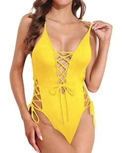 Make a splash in this stunning deep plunge V-neck one piece swimsuit, featuring a sexy lace up front and comfortable high cut bottom for a stylish and flattering look.