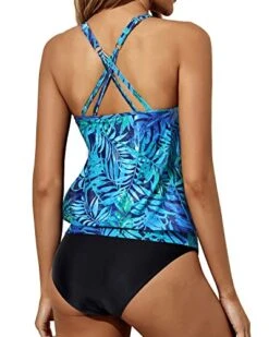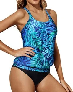 This blouson two-piece tankini swimsuit is flared and flattering with the blouson style. The loose fit tankini top is matching with a mid-waist stripe triangle bikini bottom, which is perfect for tummy control. The criss-cross back swim top has adjustable shoulder straps and a soft, removable padded push-up bra.