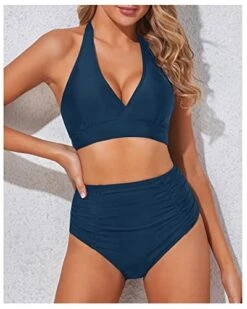 Feel confident and beautiful in the Women Two Piece High Waisted Bikini Set Swimsuits, designed with a push-up retro V-neck top and ruched high-waisted bottoms that provide tummy control and a slimming effect.