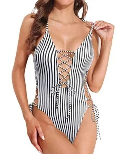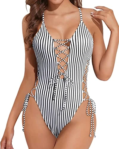 This slimming bathing suit provides moderate coverage and adds chic interest to your tropical beach look with its strappy lace up design.This flattering swimsuit for curvy women features a high-cut bottom style that showcases your long and attractive legs, making you stand out on the beach.