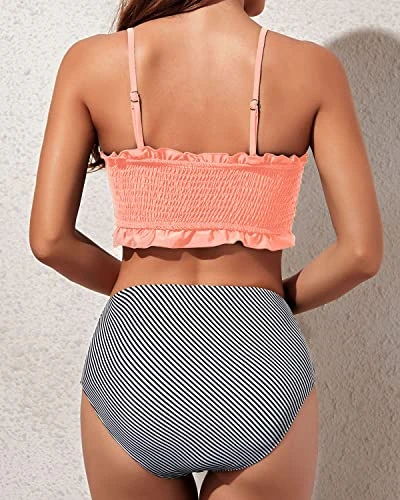 With a cute and attractive smocked and ruffle bikini top, adjustable shoulder straps, and high waisted bottom for tummy control, this black two piece bathing suit is perfect for tropical vacations, summer, beach, swimming pool, honeymoon, or any occasion where you want to feel confident and stylish.