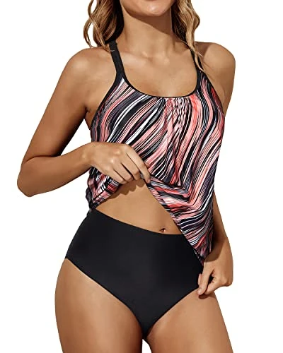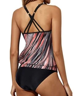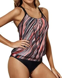 These two piece casual sporty bathing suits feature a blouson tankini top with tummy control and a matching mid waist bikini bottom, perfect for a modest yet cute vibe.