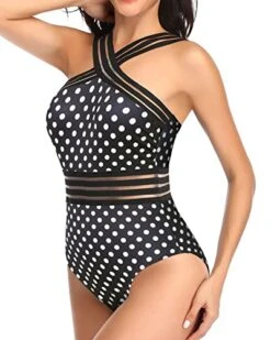 The crisscross mesh strap black dot one-piece swimsuit with tummy control mesh panel and removable padded push-up bras flatters your silhouette and feels comfortable.