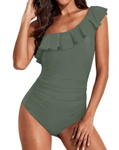 Make a statement in this Women One Piece Swimsuit, featuring a flattering front ruched design, one shoulder asymmetrical neckline, and a playful ruffle for a feminine touch.