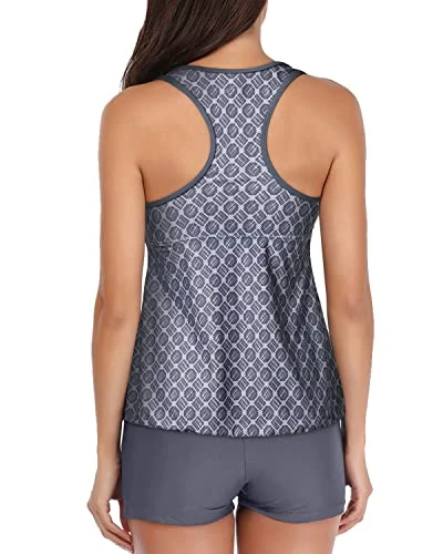 Show off your curves in this sporty yet feminine two-piece V neck racerback tummy control tankini bathing suit, featuring a comfortable, flowy tank top and boy shorts for full coverage.