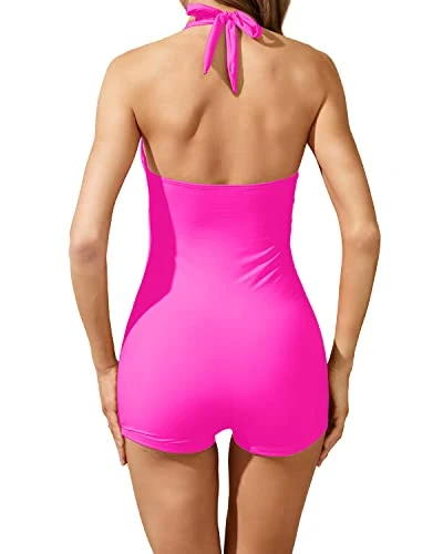 This retro-inspired one piece swimsuit with shorts and boyleg design offers tummy control and adjustable halter top for women of all ages.