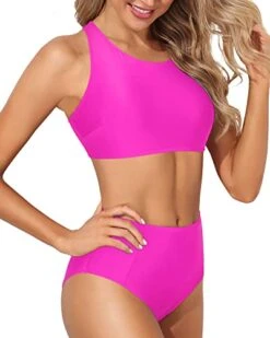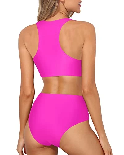 Enjoy your beach vacation or pool day in style with this trendy and flattering high waisted sporty racerback bikini set, designed to cover imperfections and highlight your best features.