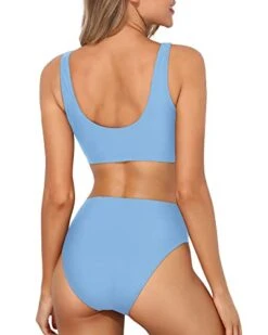 Feel comfortable, confident, and stylish in this sporty bikini set with a scoop neck top and full coverage bottom, made with elastic and comfy material that won’t be see-through, perfect for moms, teens, and young women who want to enjoy their time at the beach or pool without worrying about their swimwear.
